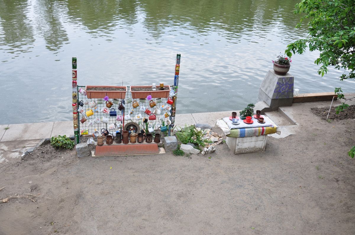 Dostávám se přes zábradlí na náplavku. Stojím přímo u vody a připadám si jako u někoho na zahradě. Na dlažebních kostkách si pan Šíma vytvořil několik záhonků.