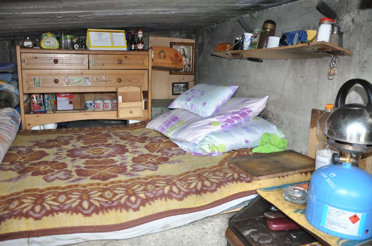 „Mám tam lůžko, nějaký nábytek a mám tam stoleček, kde mám vařič. Na tom si ohřívám nebo vařím jídlo.“