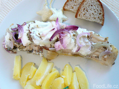 • Cibuly nakrájíme na půlkroužky, česnek na plátky. Nasypeme přes filety.